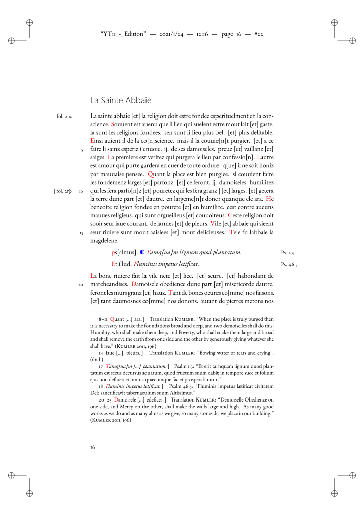 Here’s a first glimpse into the very early stages of my transcription of manuscript Yates Thompson 11. It is typeset in LaTeX via LyX and TeXstudio, using the reledmac package. For the time being I will have to limit the scope of this work to the manuscript’s first three tracts, i.e. the Sainte Abbaie, the „Traité de l’amour de Dieu“, and the Liures de Lestat de Lame.