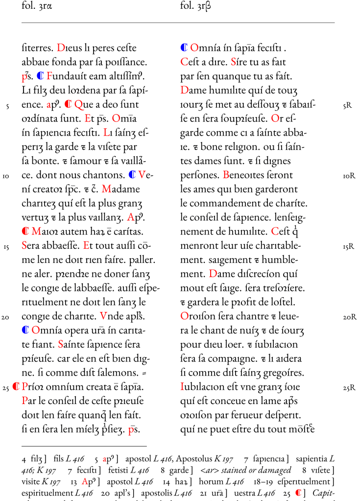 In this case, the references in the critical apparatus are to differences in the transcriptions by Janice Pinder (in The Abbaye du Saint Esprit: Spiritual Instruction for Laywomen, 1250–1500, link) = P, by Aden Kumler (in Translating truth. Ambitious images and religious knowledge in late medieval France and England, link) = K, and by Cornelia Logemann (in Heilige Ordnungen. Die Bild-Räume der „Vie de Saint Denis“ (1317) und die französische Buchmalerei des 14. Jahrhunderts, full text) = L.